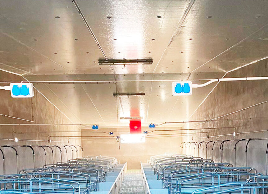 Panel Fachada Falso Techo está concebido para la instalación de falsos techos ligeros y aislantes en entornos ganaderos, fijado mediante tulipas soporte con tornillos o varillas roscadas sobre estructuras metálicas adecuadas. Puede colocarse en horizontal o trasdosando la cubierta desde las correas. Su núcleo actúa como barrera de protección frente a vapores agresivos presentes en granjas porcinas u otras naves de ganadería.